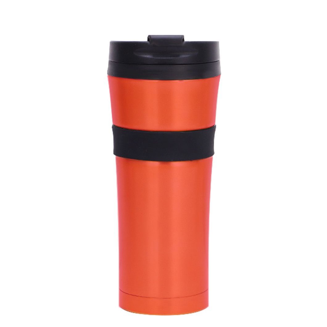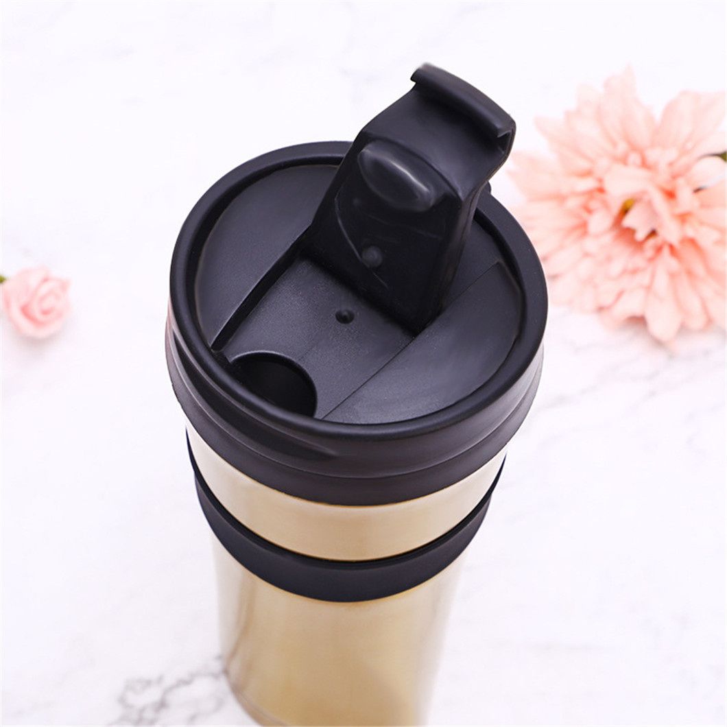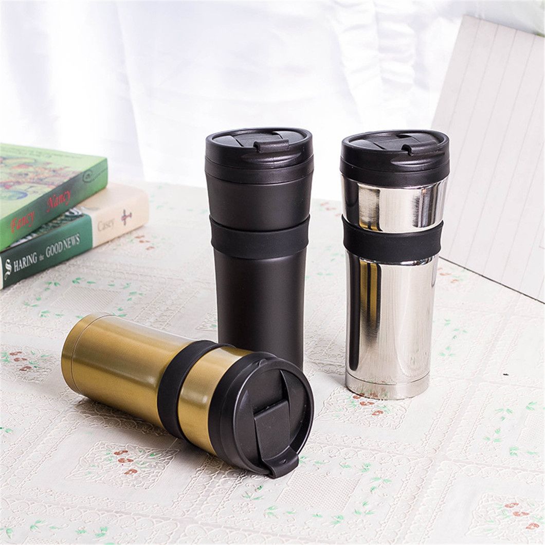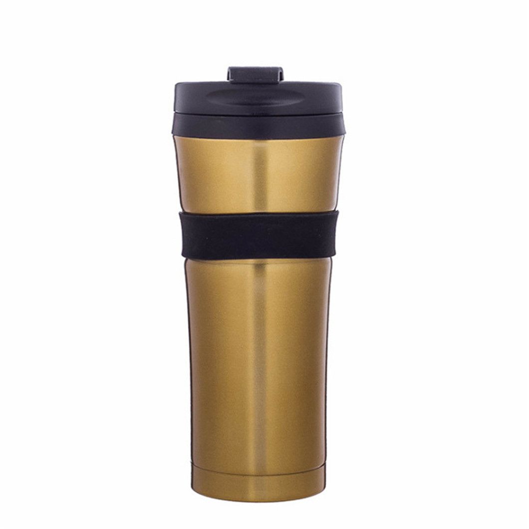 Ce thermos en acier inoxydable est disponible en finitions en or, en noir et en argent, avec des options de personnalisation disponibles. Avec un couvercle noir élégant et une bague en caoutchouc noir durable au centre qui empêche le glissement et protège la tasse, il est parfait pour transporter vos boissons quotidiennes comme le café ou l'eau chaude.