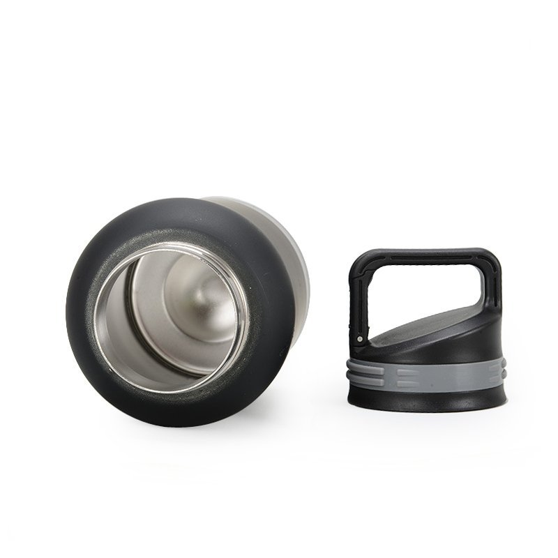 Cela fait partie d'une bouteille d'eau isolée, avec une doublure intérieure en acier inoxydable. La doublure a un lustre métallique. À côté se trouve un couvercle avec une poignée. La doublure intérieure en acier inoxydable est bénéfique pour la préservation de la chaleur, la résistance à la corrosion et la garantie de l'hygiène et de la qualité de l'eau potable.
