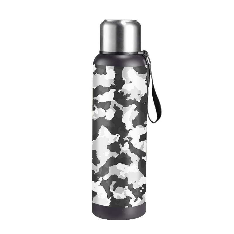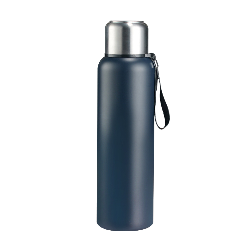 Il mesure 30 cm de hauteur et 9 cm de diamètre, avec une capacité de 1100 ml. Fabriqué en acier inoxydable, il peut efficacement garder les boissons chaudes ou froides pendant longtemps. Il y a une sangle noire attachée, ce qui le rend pratique pour le transporter, adapté à des activités quotidiennes, de voyage ou de plein air.