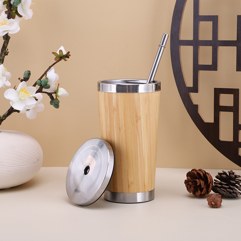 Une tasse isotherme créative à double couche en acier inoxydable fabriquée à partir de bambou, incarnant l'élégance raffinée du travail et de la vie quotidienne.